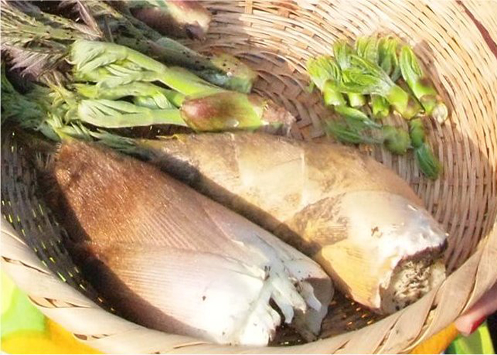 宅内西側の雑木林に混ざり込んだ竹林の竹の子は、雑木の日陰で育ち柔らかく豆乳のような甘さの新鮮味です。猪豚さんに負けずに掘らないと・・・道具は宿で。ぜひ、ご自分で竹の子を掘り、皮をむき、宿のおかあさんにシャブシャブを作ってもらってください。足で探りなら竹の子を見つける・・・はて・・・みつかるでしょうか。