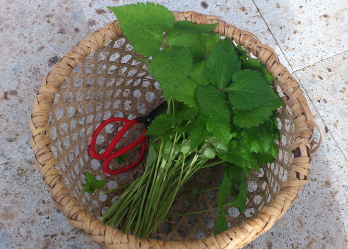 季節には、宅内の里山で懐かしくヨモギ摘み。ヨモギの葉を綺麗にして、おかみさんお願~い。灰汁ぬきしたヨモギをすり鉢で潰しましょう。潰し終ったころ、ふかしたての熱~いお餅が届き!今度はこねる。こねればこねるほどヨモギが混ざり、綺麗な緑色のヨモギ餅の完成です!熱~い!!ヨモギ餅をちぎったまま黄粉をつけて食べる。あるいは丸めてお団子!饅頭形もよし、形より取り立て作り立てを食べる。実においし~い!!!!!