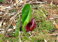 2月末から咲き出します。山の植樹替えの伐採を行うまでは、かなりの数が咲いていました。しかし、伐採により日陰の条件が変わったせいか、現在では数が少なくなっていますが、広葉樹の成長とともに元通りのザゼンソウ地帯となることと思います。カメラを片手に散歩の途中にお顔を見てください。